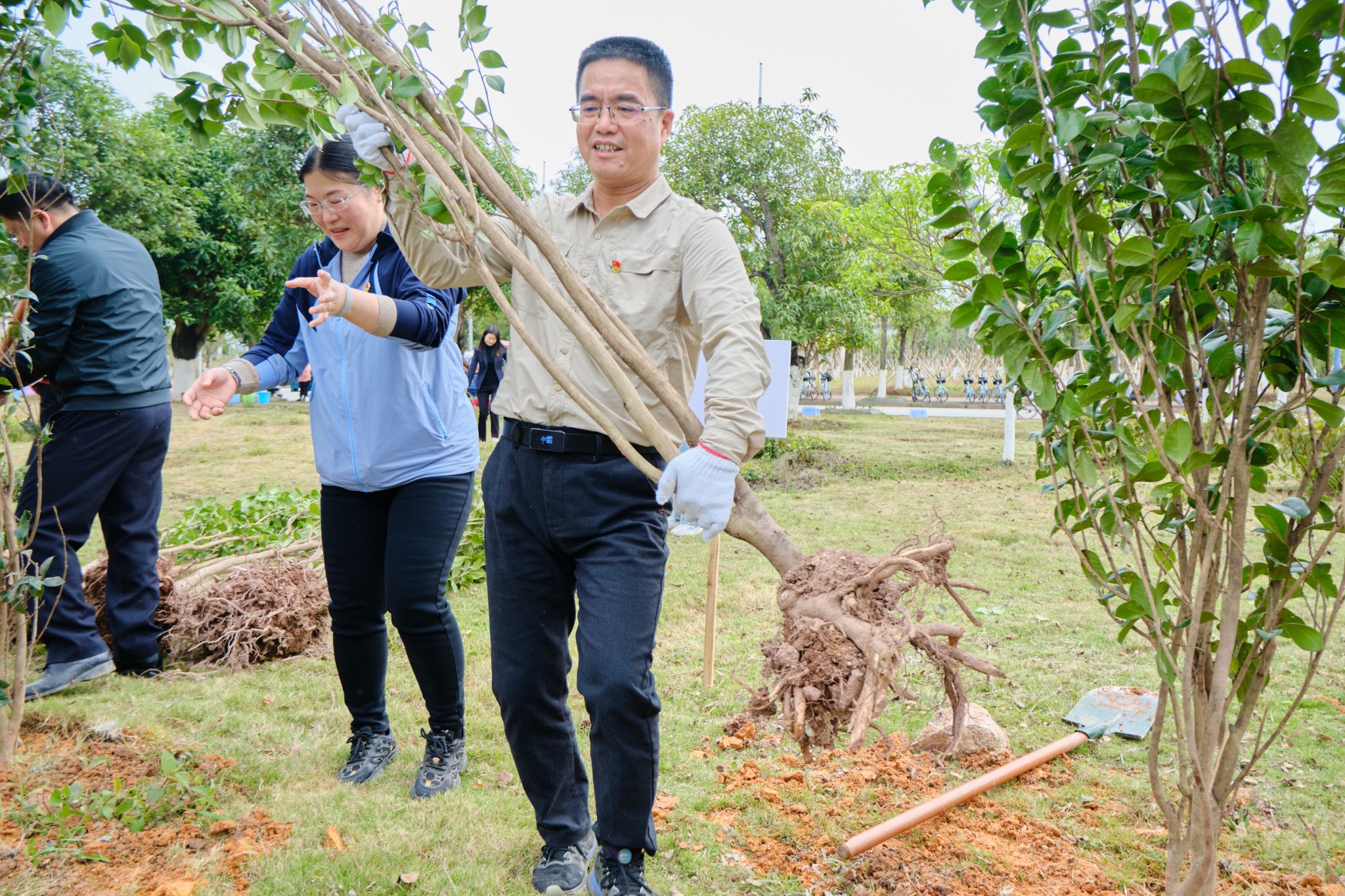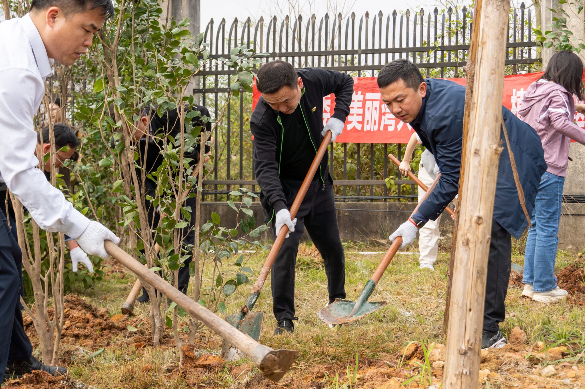 苗剑校长(中)、陈磊副书记(右)与支部成员一同植树