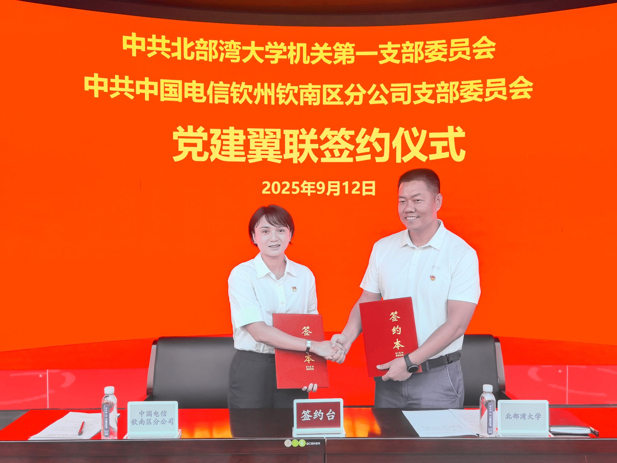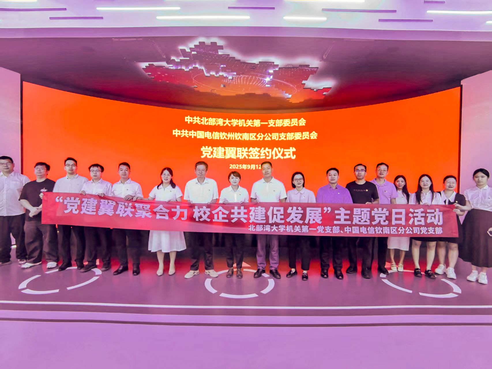 9月12日下午,中共北部湾大学机关第一支部委员会与中共中国电信钦州钦南区分公司支部委员会在中国电信钦州分公司政企大楼一楼5G展厅隆重举行“党建翼联”共建协议签订仪式。此次活动以“党建翼联聚合力 校企共建促发展”为主题,旨在深入学习贯彻习近平新时代中国特色社会主义思想,落实新时代党的建设总要求,进一步加强校企党组织交流与合作,共同构建“党建引领、优势互补、资源共享、共同发展”的党建工作新格局。北部湾大学党政办主任、机关第一党支部书记熊拯,党政办副主任李远红,中国电信钦南区分公司党支部书记、总经理陆媛,副总经理蒙宇彬、吴颖洁等领导出席仪式。双方支部党员代表共20余人共同参加了本次活动。
